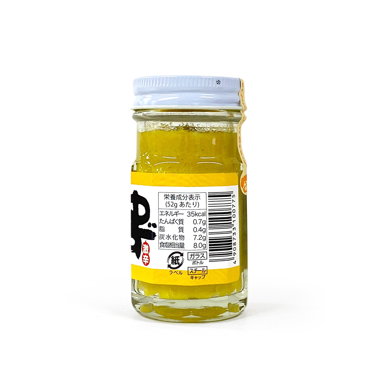 黃鬼柚子胡椒是用成熟的黃色柚子和完全成熟的黃色超級辣椒製作而成。沒有加入其他色素,自然的黃色讓人垂涎欲滴。黃色辣椒的辣度比青辣椒更高,據說其「史高維爾辛辣單位」(Scoville heat unit, SHU)在10萬至12萬SHU之間(約為日本產的鷹爪椒的兩倍),這個數值越高就越辣。推薦給喜歡吃辣的顧客。