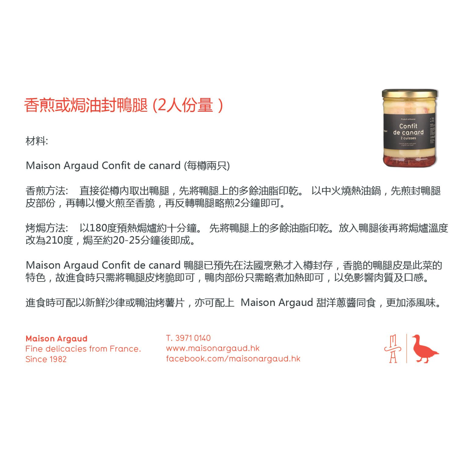 Maison Argaud Confit de canard 鴨腿已預先在法國烹熟才入樽封存,香脆的鴨腿皮是此菜的特色,故進食時只需將鴨腿皮烤脆即可,鴨肉部份只需略煮加熱即可,以免影響肉質及口感。